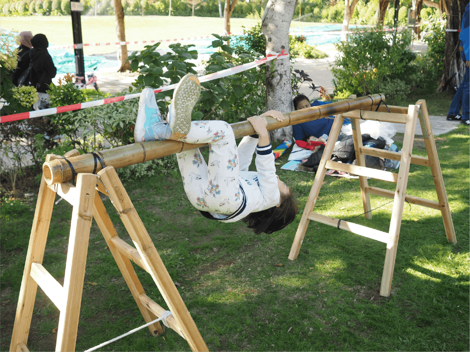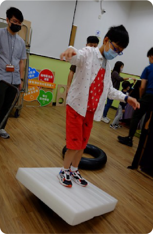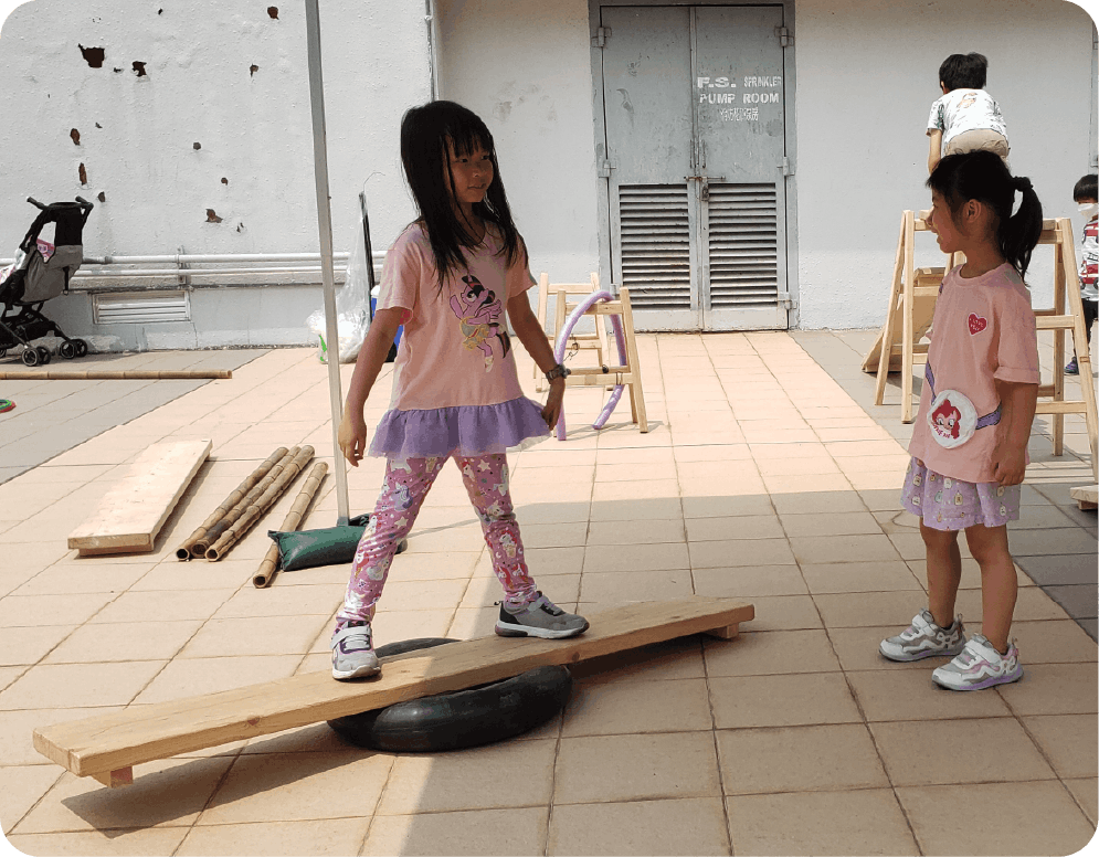 將彈性的物料放在木板中間,便可製成搖搖板在多條同一高度的木梯上,放上相應木板,創造高人一等的平衡遊戲