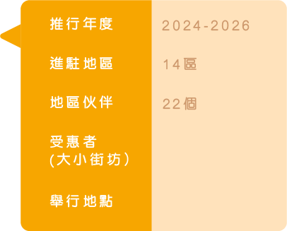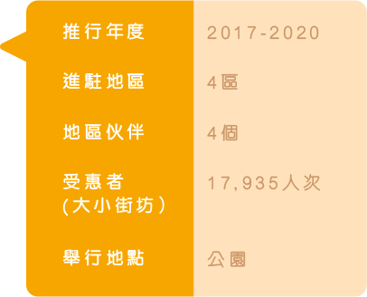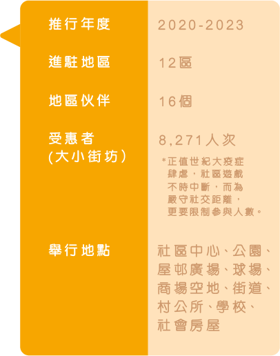 獲香港賽馬會慈善信託基金的支持,我們於 2017年開展首個為期3年的「賽馬會智樂好玩 社區同盟」計劃,並於2020年再獲捐助延續 推行3年,進駐據點亦由4區擴展至12區。 至2024年再獲第三輪捐助,得以推動計劃持 續發展,除新增2個地區外,將於既有地區聯 繫更多有心的地區伙伴,建立更多鄰近民居的 遊戲基地,並將深化鄰舍街坊的社區參與程度 ,期望於各區召集「好玩家庭」成為遊戲基地 的骨幹盟友,共同打造好玩的社區遊戲。