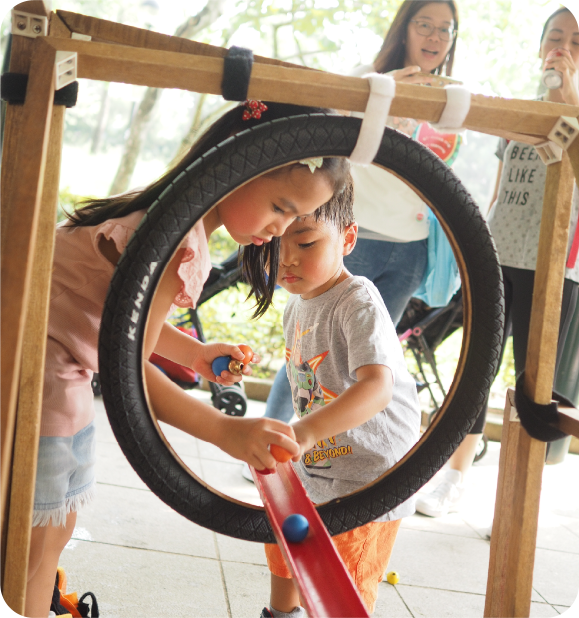 把車軚放在地上,即可變成簡易的相撲遊戲放在高高的木板上,令過橋遊戲變得刺激